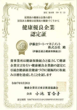 伊藤忠リート・マネジメント株式会社(以下、「当社」といいます。)は、2025年9月26日付で「健康優良企業 金の認定(以下、「本認定」といいます。)」を3年連続で取得いたしましたので、お知らせいたします。(認定番号 協金第159号(2))